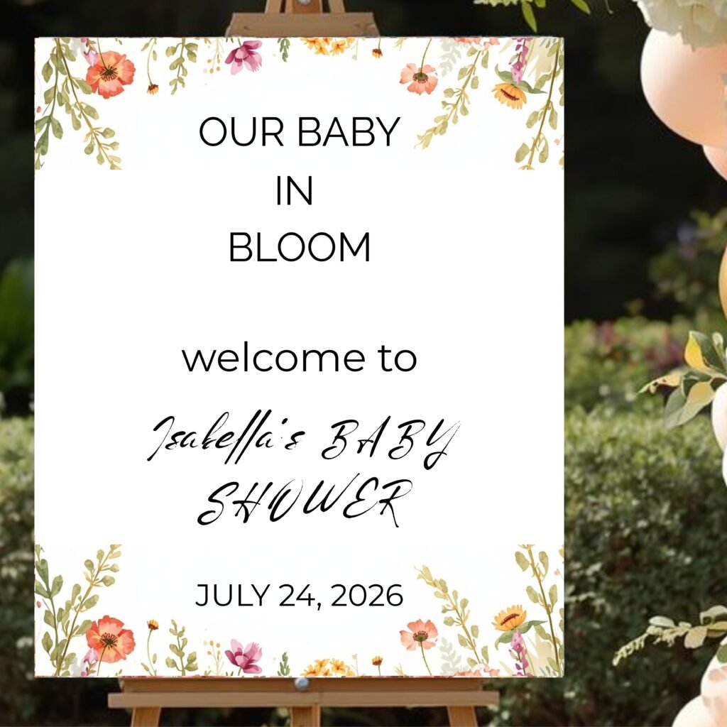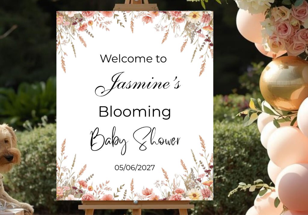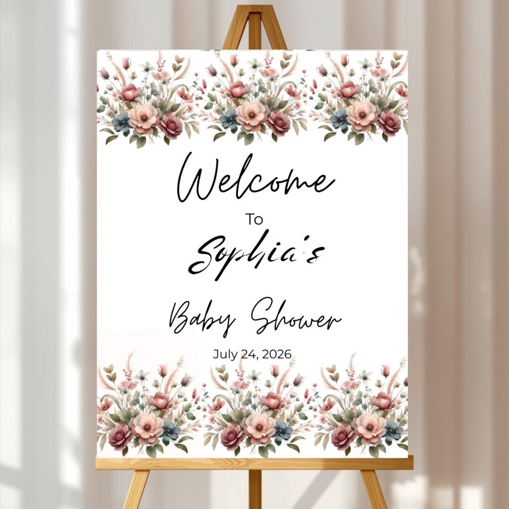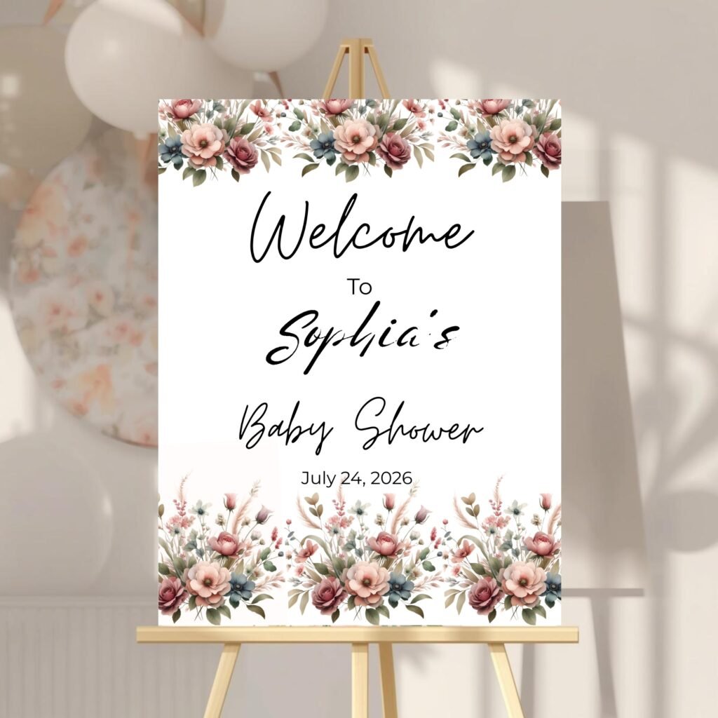 Welcome your guests with this floral baby shower welcome sign, featuring a soft, romantic design – perfect for celebrating your little one’s special day. This printable welcome poster is ideal for entrance tables, near the gift table, or as a beautiful photo backdrop at your baby shower.