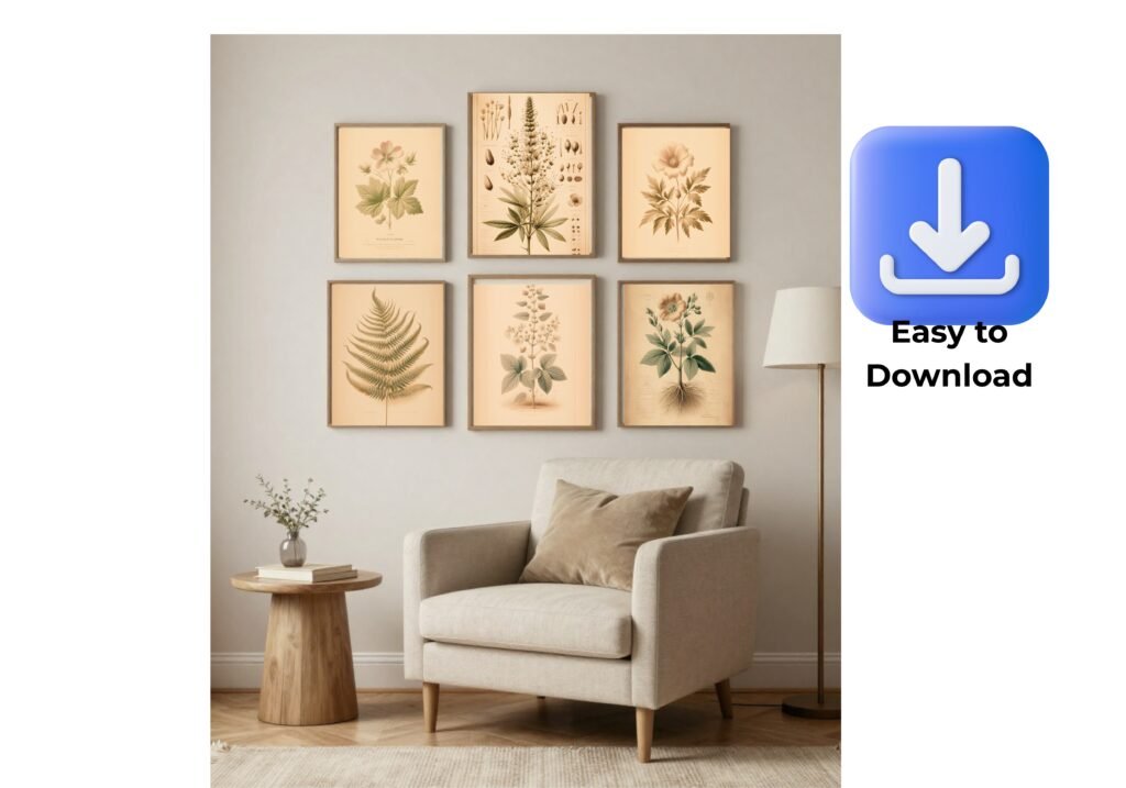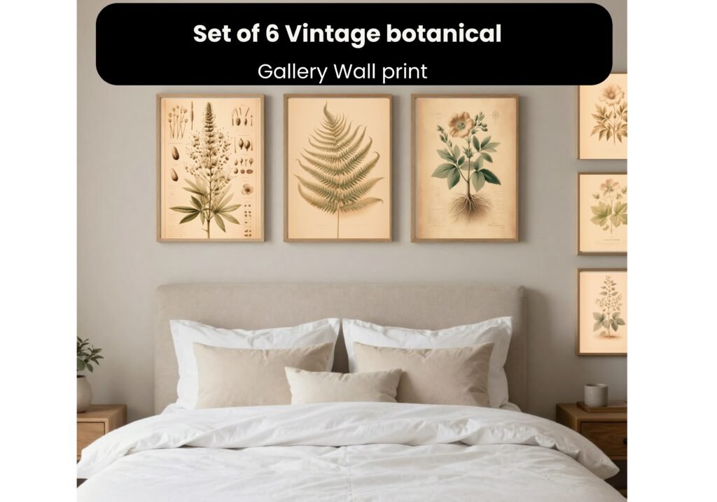 Vintage botanical set of 6 printable wall art in an antique engraving style, perfect for a neutral gallery wall in any room. High‑resolution JPG files (300 DPI) in multiple aspect ratios (2:3, 3:4, 4:5, 5:7, 11:14 and ISO sizes) are delivered as ZIP files for instant digital download and easy printing at home or with a print service, for personal use only.